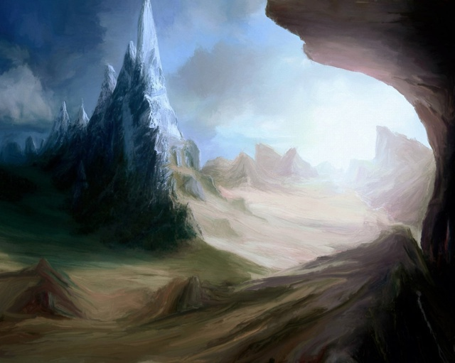 Эта картина переносит зрителя в безлюдный ландшафт, где резкие горные пики пересекаются с мягкими изгибами пустынной равнины. Сочетание холодных синих тонов и тёплой охры создаёт ощущение движения воздуха и света. Жёсткие формы и размытые переходы между светом и тенью провоцируют внимательный взгляд, предлагая рассмотреть текучесть природы через структуру, лишённую присутствия человека.