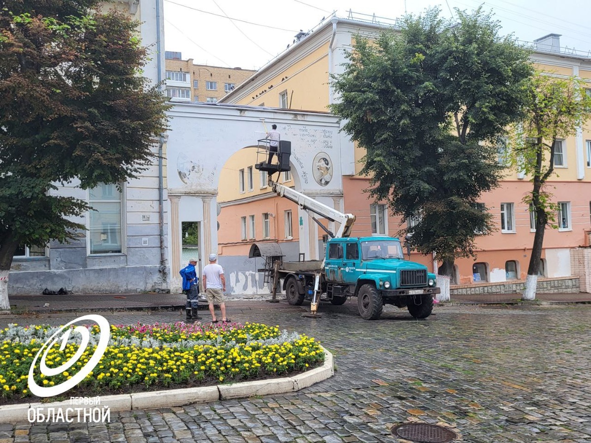 Фотофакт: на ул. Ленина в Орле сегодня закрасили портреты и надписи на арке между домами.