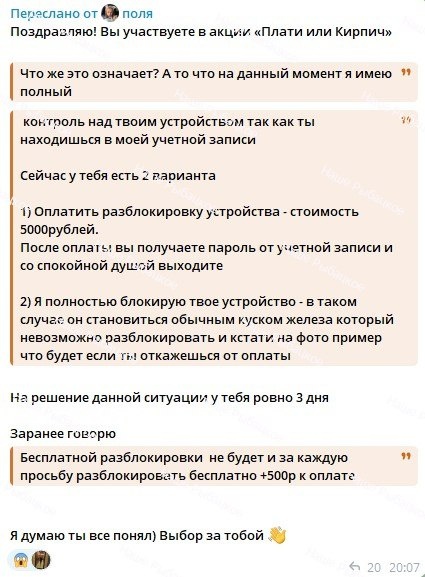 Старый развод, на который все продолжают попадаться. Мошенник под видом жертвы просит помощи, которая заключается в авторизации в Apple ID, логин и пароль которого он вам присылает. После того как вы «заглотили наживку», мошенник просто меняет пароль учетной записи и получает доступ к блокировке вашего устройства. В итоге вам приходит «письмо счастья» 🤷♂ Вчера в 8 вечера один из наших соседей уже потерял доступ к своему смартфону. Переводить деньги бесполезно, но есть статья, в которой описано как вернуть свое устройство 👇 https://vk.cc/cO9DSQ Другие новости
