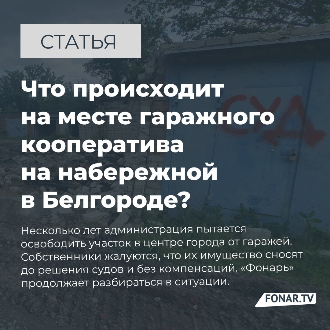 🚧 Гаражи сносят — суды идут: что происходит по соседству с набережной Белгорода? На месте гаражного кооператива в центре Белгорода — между улицей Пугачёва и рекой Везёлкой — уже снесено около 70 процентов построек, причём часть из них всё ещё находится в собственности граждан. Некоторые владельцы уверены: всё это якобы происходит до решения суда, а гаражи рушат без компенсации, несмотря на начатые процессы. Официально мэрия объясняет снос строительством ливнёвой канализации, но владельцы гаражей утверждают: настоящая цель — подготовка территории под элитный жилой комплекс «Русские сезоны», о котором ранее говорил губернатор. Вопросов к работе подрядчика становится всё больше — от вандальных надписей краской на воротах до отсутствия инженерных изысканий и ограждения в водоохранной зоне. 💬 Подробности — в новой статье «Фонаря». Мы разбираемся, кто и на каких основаниях сносит гаражи, почему на месте снесённого бокса оказался разбитый автомобиль, и почему суды могут перевернуть истор