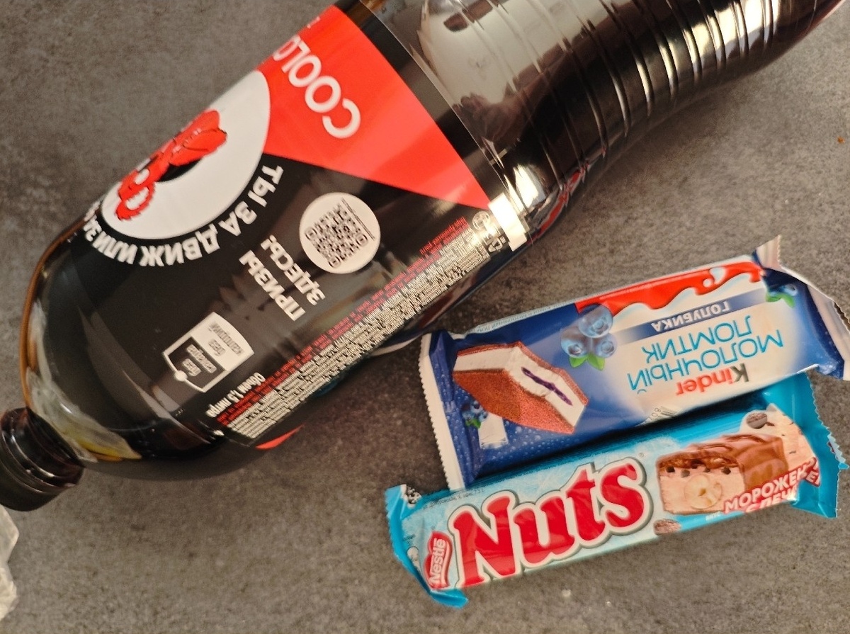 С 50% скидкой по купону была куплена кола, молочный ломтик и баточник(кстати потом я купила ещё один по купону, но сфотографировать забыла):