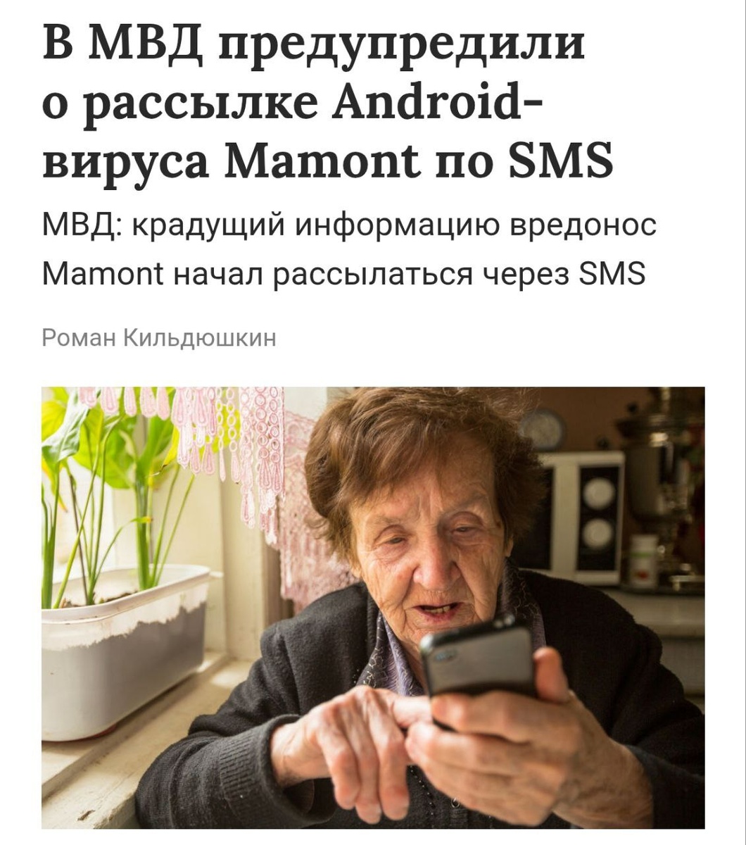 Россиян скамит MAMONT, буквально — МВД предупредило о новой волне вируса. Работает так: жертве пишут с незнакомого или взломанного аккаунта с сообщением «Это ты на фото/видео?» и кидают apk-файл. После установки вирус Mamont получает полный доступ к SMS, push-уведомлениям и галерее. Ранее он уже гулял по стране, но теперь возвращается с новой силой. Предупреди бабушек/дедушек! CtrlAltDelights- подписаться