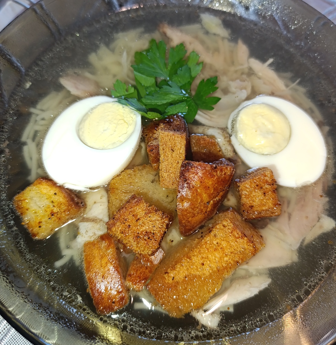 Ингредиенты: курица (разные части) вермишель сухарики яйцо соль по вкусу зелень для подачи Я готовлю этот супчик без специй. Отвариваем курицу до готовности. Я беру приблизительно около 70 гр курицы на 1 порцию. Достаем курицу, остужаем немного, отделяем от косточек и измельчаем. Возвращаем в кастрюлю, доводим до кипения, солим. Добавляем вермишельку, доводим до кипения, накрываем крышкой и выключаем. Пока наш супчик доходит и вермишелька распаривается, отвариваем яйца. Далее в тарелку наливаем супчик, добавляем яйцо разрезанное пополам, посыпаем зеленью и сухарями. Приятного аппетита!!!