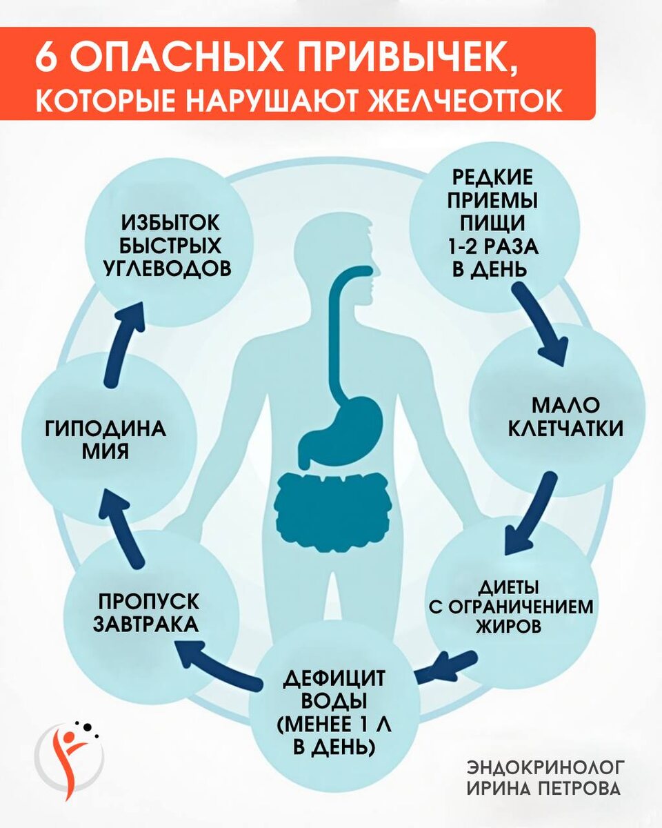 ПРИЗНАКИ ЗАСТОЯ ЖЕЛЧИ + ЧТО УХУДШАЕТ ЖЕЛЧЕОТТОК ? Холестаз (застой желчи) входит в тройку наиболее частых заболеваний ЖКТ. По статистике заболевание «молодеет» с каждым годом. В группе риска: 🔹 люди старше 60 лет 🔹беременные женщины 🔹люди с подросткового возраста, студенты, офисные работники, проводящие длительное время в сидящем положении СИМПТОМЫ, УКАЗЫВАЮЩИЕ НА ХОЛЕАСТАЗ: 🟡 Один из главных признаков проблем с желчным пузырем — тупая боль в правом подреберье. Боли могут быть острыми или тупыми, возникать после приема жирной или острой пищи, а также сопровождаться тошнотой или рвотой. 🟡 Стоит обратить внимание на нарушения пищеварения, например, изжогу, отрыжку, запоры или поносы. Эти симптомы могут указывать на проблемы с желчным пузырем. 🟡 Не стоит игнорировать и такие симптомы как: хроническая усталость, отсутствие аппетита утром, (нет желания завтракать), сонливость, горечь во рту, неприятный запах изо рта Какие привычки ухудшают желчеотток — смотрите в медиа, в бли