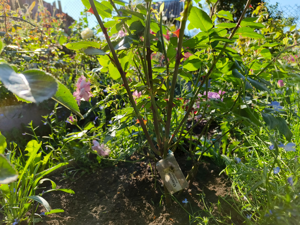 Один из этапов ухода за розами во второй половине лета - почистить низ куста от листьев примерно на 15-20 сантиметров от земли и проредить от лишних непродуктивных побегов внутри. Куст должен дышать. И конечно прополоть сорняки и порыхлить почву. Это делается для лучшего проветривания и профилактики заболеваний. После интенсивных дождей и холода обязательно обработать сад от болезней. Их лучше не допустить, иначе замучаешься потом лечить розы.Профилактика наше все! Я вырезала все трехлетние побеги у розы однократного цветения Фламентанц. Всегда стараюсь убрать лишние побеги сразу после цветения, чтобы роза не тратила на них силы.Оставляю 8-10 молодых и сильных, этого хватит для пышного цветения на следующий год. Подвязала побеги этого года к своей импровизированной опоре, чтобы их не выломало очередным ураганом или градом. А ещё вчера я посадила новую розочку🤗. У меня оставалось одно свободное посадочное место, которое никак не давало мне покоя🤣 Пошла на рынок за розой Новалис, н