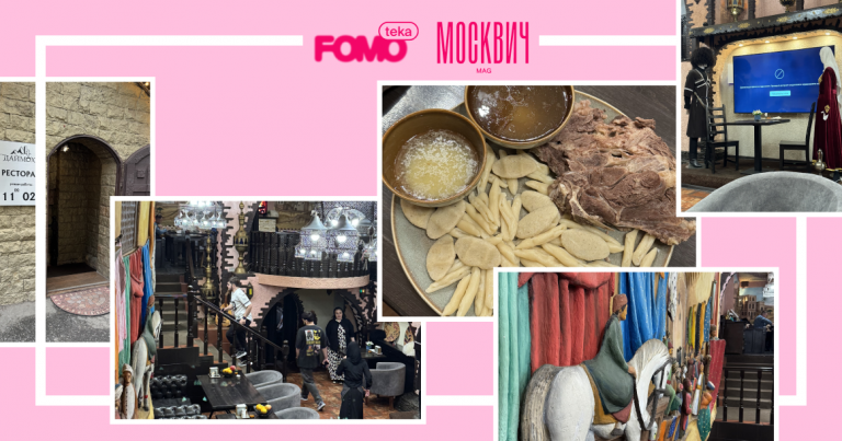 После нашего визита в сирийскую столовую на ВДНХ подписчики начали советовать самые неожиданные гастроточки, о которых знают лишь местные. Одной из таких оказался ресторан «Даймохк» в Дорогомиловском районе. Находится он в подвале жилого дома, а сам вход напоминает спуск в подземелье: все благодаря тусклому свету на лестнице и практически нетронутым кирпичным стенам. Но стоит войти внутрь — и словно попадаешь в сцену из «Великолепного века». Два этажа, свет исходит от тяжелых люстр, стены украшают лепные барельефы с пейзажами восточного базара. Наверху столики у резных перил с видом на первый этаж, внизу кожаные диваны, огромный телевизор, который сначала был выключен, а затем на нем включили видео с имитацией камина. Стало теплее, почти по-домашнему. Официантки здесь в традиционных вайнахских нарядах, рядом с «камином» стоят манекены в таких же костюмах. Названия блюд на чеченском, но под каждым есть подробное и понятное описание. Что удивляет с порога — соотношение цены и порций. Нап