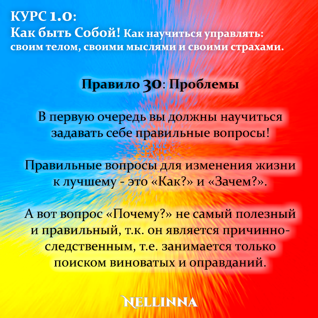 Правило 30: В первую очередь вы должны научиться задавать себе правильные вопросы! Правильные вопросы для изменения жизни к лучшему - это «Как?» и «Зачем?». А вот вопрос «Почему?» не самый полезный и правильный, т.к. он является причинно-следственным, т.е. занимается только поиском виноватых и оправданий. Выработай у себя привычку задавать правильные вопросы, и вы увидите, что ответы на них станут для вас указателем направления, помогающим двигаться вперед! Чтобы не пропустить следующую публикацию – Подписывайтесь! И делитесь полезной и бесплатной информацией! #курс #тренинг #обучение #практикум