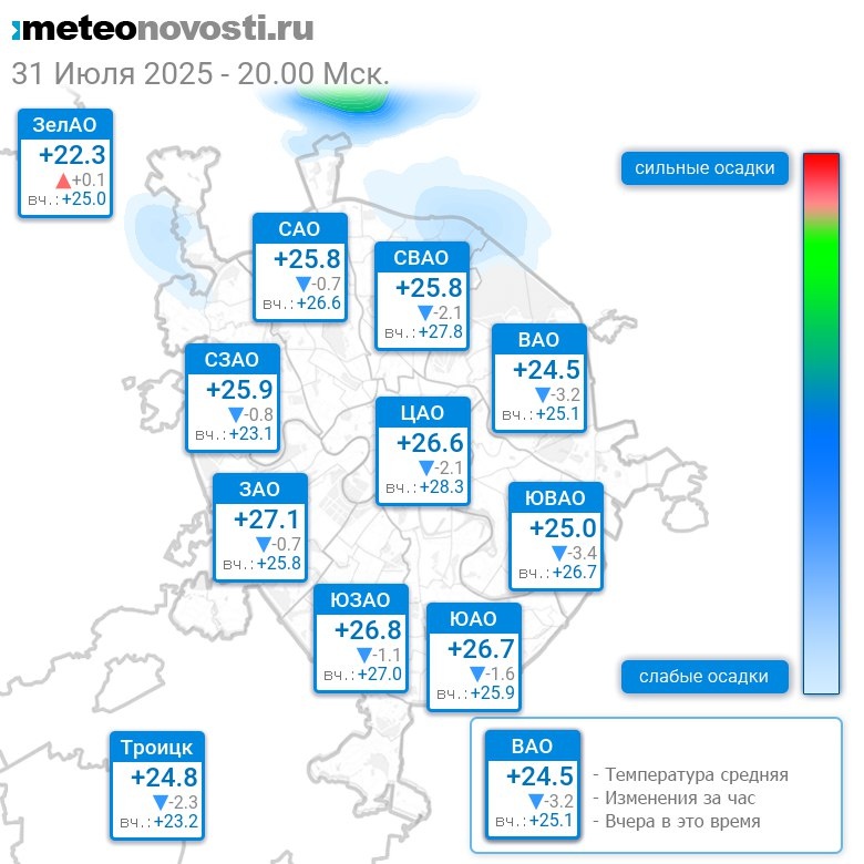 В 20:00 в Москве было от +21.5°C до +27.5°C, средняя температура +25.6°C #погода #Москва #лето #температура #31июля #четверг