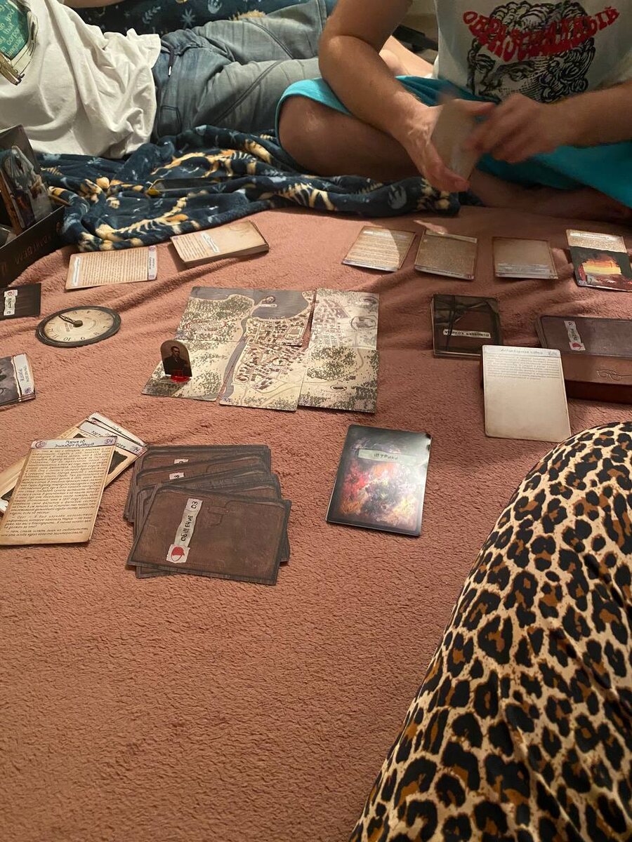 Играли в настолку по мотивам Лавкрафта. Классическая игра с выбором действий и меняющимся сюжетом. В целом было интересно, но уж больно много надо читать, особенно когда ты играешь в компании. И если вы думаете, что котики спокойно сидели на руках все 2,5 часа или сладко дремали, как же вы ошибаетесь 😅