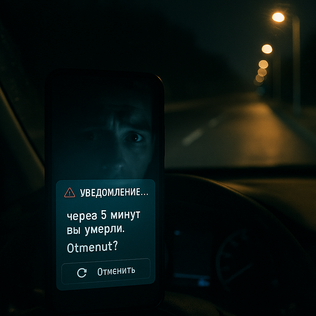 🧭 «Я получил уведомление… из будущего. Оно пришло ровно через 5 минут после моей смерти» > 📲 “5 минут назад вы умерли. Хотите отменить?” --- 📅 Четверг, 23:41 Я ехал домой, как обычно — маршрут знакомый, ночь, пустынная дорога, телефон в держателе, играет подкаст. Уже подъезжал к дому, когда телефон погас. Мгновенно. Подумал: "Разрядился". Проехал ещё пару метров — и всё вокруг изменилось. --- 🚧 Что-то не так Лампы вдоль дороги начали гаснуть одна за другой, будто что-то двигалось сзади. Я почувствовал дрожь в груди, будто сердце остановилось на долю секунды. Остановил машину. Внутри было абсолютно тихо. Ни ветра, ни фонового гула — ничего. Только собственное дыхание. И тут... --- 📲 Уведомление Телефон включился сам по себе. Я взял его в руки. На экране — только одно уведомление: > “🕒 Вы умерли 5 минут назад. Хотите отменить?” [🔁 Отменить] [⏳ Оставить всё как есть] Это не был спам, фишинг или игра. Это было в системном интерфейсе телефона, как обычное push-