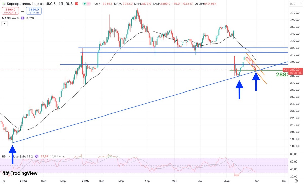 Х5 опустилась на наклонную поддержку, которая начинается аж с 15 декабря 2023 года 🤓 В стакане вновь весь день был виден навес. Посмотрим, удержимся ли выше линии тренда 🤔 13 августа отчёт за 2 кв по МСФО, возможно он послужит драйвером для переоценки, особенно, если выяснится, что выкупили 10% бумаг с хорошим дисконтом 🤞 В любом случае, компания по-прежнему остаётся одним из моих главных фаворитов на рынке в целом 🥇