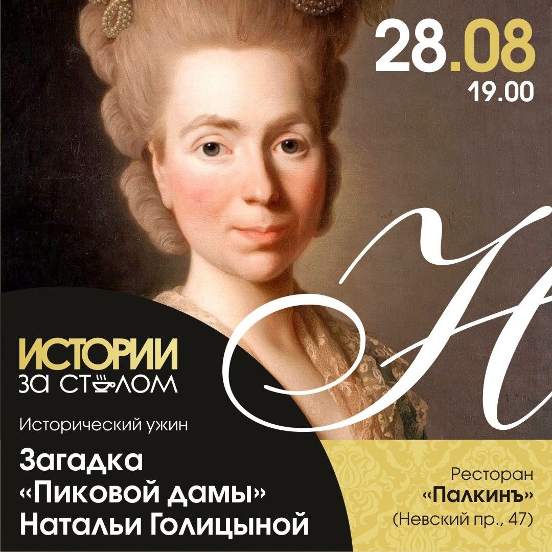 ♠Исторический ужин "Загадка Пиковой дамы" Натальи Голицыной 28 августа в 19.00 ✔️Ресторан "Палкинъ" (Невский пр., 47) Перед княгиней Натальей Голицыной трепетали все окружающие, и даже Император Николай I не смел ей возражать. Пережив пять царствований, она прожила бурную жизнь и вошла в историю, как «Пиковая дама». На нашем вечере от историка Татьяны Цветковой вы узнаете: ✨Какое приданое оставил Наталье Голицыной Пётр I; ✨Как юная Натали покорила Версаль; ✨Почему Екатерина II сделала её первой фрейлиной; ✨Как Наталья Голицына подружилась с королевой Марией-Антуанеттой; ✨Почему княгиня стала обладательницей тайны трёх карт; ✨Как Пушкину удалось заслужить у княгини снисхождение. В меню - блюда, историю которых вы узнаете: 1⃣Холодное из уток с апельсиновым соусом; 2⃣Суп-крем с артишоками и фундуком; 3⃣Телятина Марешаль; 5⃣Зеленая спаржа с голландским соусом; 6⃣Мороженое «De Luxe Палкинъ» с фруктами маседуан. 7⃣Бокал игристого вина 8⃣Чай/кофе на выбор. Стоимость - 5990 рублей. Запи