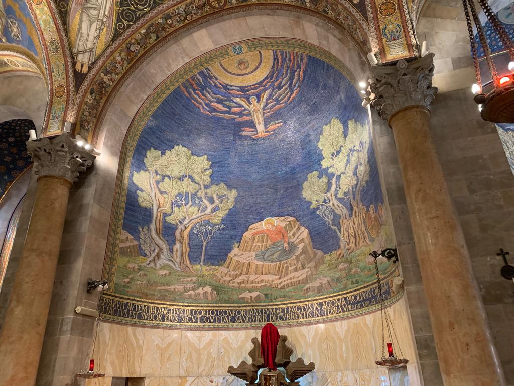 Над алтарём помещена мозаика, на которой изображена сцена с молитвой Иисуса в Гефсиманском саду. По бокам можно увидеть другие библейские события - Иудин поцелуй, предательство и арест Христа.