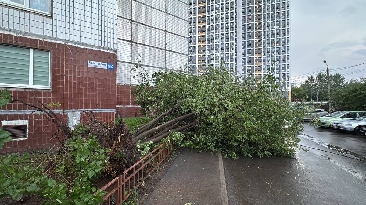 Пятиминутный ливень вырвал дерево с корнем у дома №111/2 на Ярославском шоссе