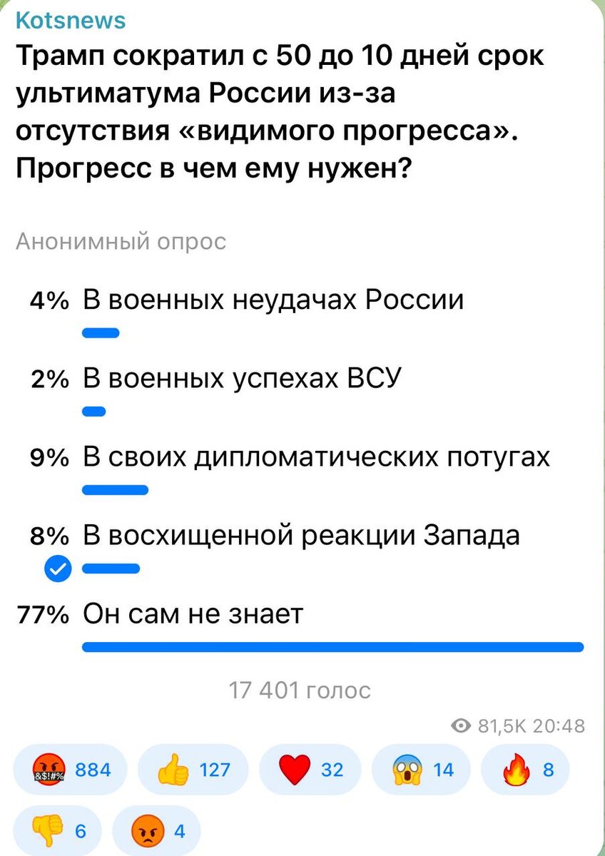 ⚡️⚡️⚡️ 77 процентов подписчиков считают, что Трамп и сам не знает, чего хочет. Такой уж он, внезапный Донни.