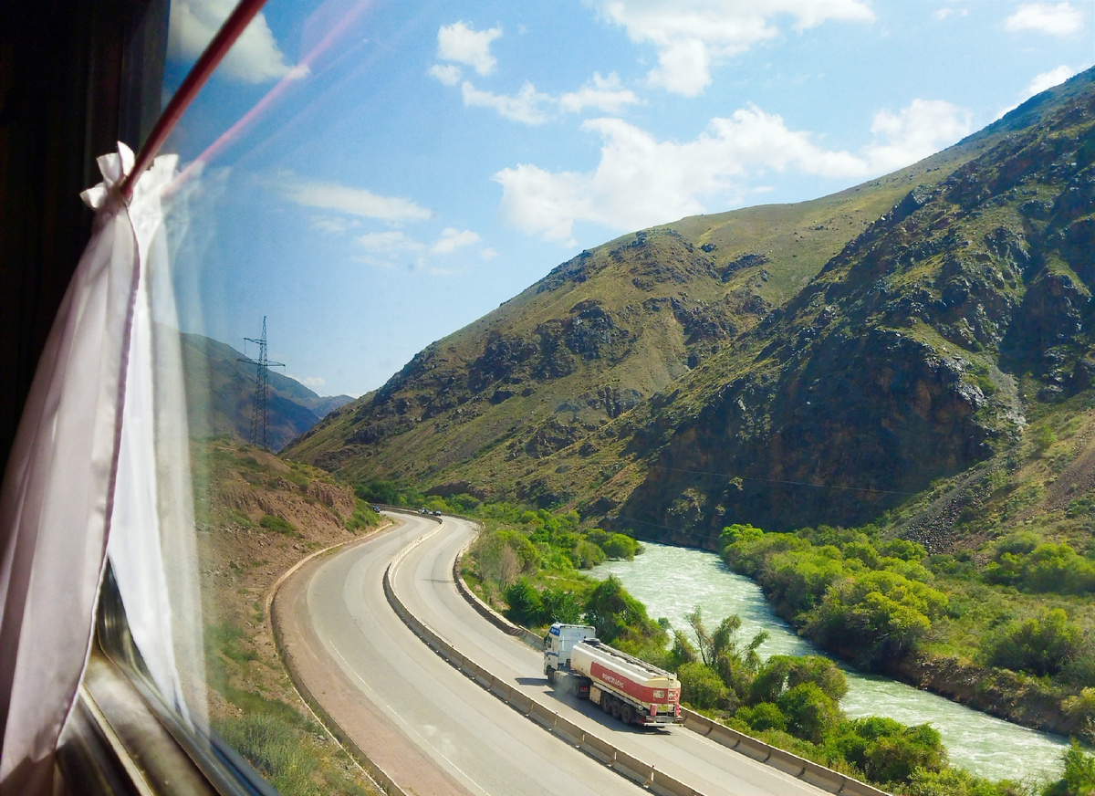 В шесть утра взяли на ресепшене отеля боксы с завтраком и отправились на ж/д вокзал "Бишкек-2". Кассы открылись в 6:30, но уже выстроилась очередь за билетами. Поезд на Иссык-Куль из Бишкека в Балыкчы отправляется в 7:40. Место в стандартном вагоне стоит 150 сом, билеты в вип-вагоны (за 800 сом) с панорамными окнами давно раскуплены онлайн, российские карты к оплате не принимают. По этому маршруту состав курсирует только летом - сначала три раза в неделю, потом каждый день: до 14 июля по пятницам, субботам и воскресеньям, с 15 июля по 31 августа ежедневно. Вдруг кому пригодится: прибытие на станцию "Балыкчы" (альтернативное название: ст. Рыбачье) в 11:46. Обратно отправление из Балыкчы в 18:12, прибывает на станцию "Бишкек-2" в 22:18. Поезд едет вдоль горных рек между вершин Тянь-Шаня, где речка Чу соединяется с другими, и вместе они образуют Большой Чуйский канал. Дорога очень живописная, проходит по горной местности через ущелья. Строили её советские немцы-переселенцы. В трудовых