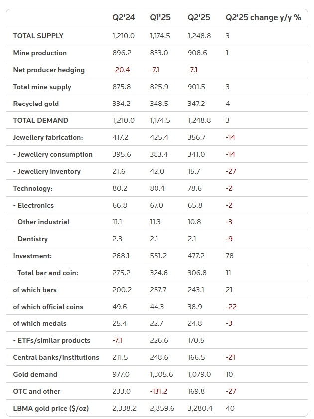 Тем не менее, по оценкам Всемирного золотого совета, мировой спрос на золото вырос на 3% во 2 квартале 2025 г. на фоне роста инвестиций. Потребление золота в Индии в 2025 году, как ожидается, упадет до пятилетнего минимума, поскольку рекордно высокие цены сдерживают покупки ювелирных изделий, затмевая небольшой рост инвестиционного спроса, сообщил 31 июля Всемирный золотой совет. Индия — второй по величине после Китая потребитель золота. Спрос на золото в этой стране в 2025 г. может составить от 600 до 700 тонн, что является самым низким показателем с 2020 года и ниже прошлогодних 802,8 тонн, сообщил агентству Сачин Джайн, генеральный директор индийского подразделения WGC. По его словам, если цены стабилизируются, спрос может достичь 700 тонн, однако рост цен на 10–15%, вызванный геополитическими факторами, может снизить его до нижней границы диапазона. Внутренние индийские цены на золото, достигшие рекордного уровня в 101 078 рупий за 10 граммов в июне, выросли на 28% с начала 2025 го