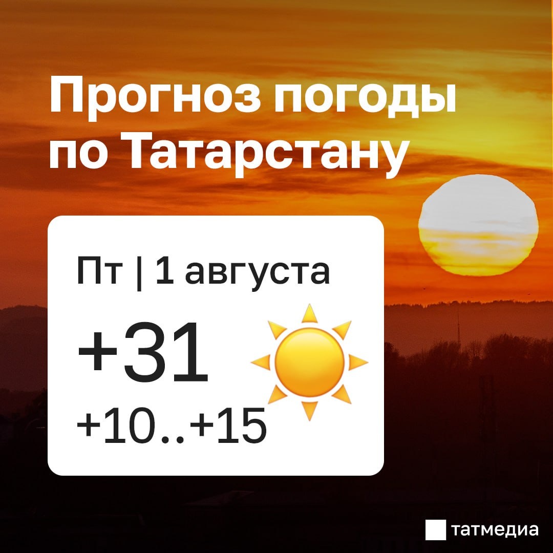 В ответ на пост 🌡☀️Погода в Татарстане останется теплой, но к воскресенью придут дожди Существенных изменений в погодных условиях 1 августа не прогнозируется. Вероятность осадков остается крайне низкой. С началом выходных атмосферная ситуация начнет постепенно меняться: Несмотря на сохраняющийся высокий температурный фон – ночью +14…+20 °C, днем до +27…+32 °C – возрастет вероятность осадков. В субботу, 2 августа, ночью осадков не ожидается. Однако в дневные часы, на фоне приближения атмосферных фронтов, в западных районах республики местами возможны кратковременные дожди и грозы. При этом ветер может усиливаться до 15-20 м/с. В воскресенье, 3 августа, метеорологи прогнозируют развитие грозовой активности с кратковременными осадками и усилением ветра до 20 м/с, что будет связано с продвижением фронтальных разделов юго-западного циклона. Согласно предварительному прогнозу, в начале следующей недели в Татарстане сохранится неустойчивая погода: местами ожидаются кратковременные гроз