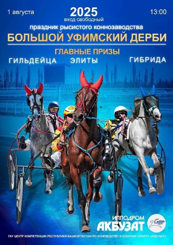 В Уфе на ипподроме «Акбузат» пройдет праздник рысистого коннозаводства «Большое уфимское дерби». Всех любителей конного спорта на мероприятие пригласил глава администрации Октябрьского района г. Уфы Антон Тарасов. В программе будут захватывающие соревнования, в которых примут участие самые сильные и быстрые рысаки. В числе запланированных событий: Поддержать фаворитов и зарядиться адреналином можно будет на ипподроме «Акбузат» 1 августа в 13.00. 6+