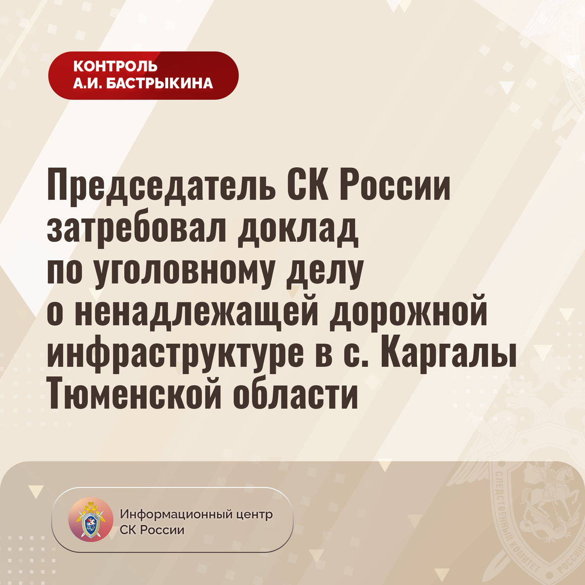 Председатель СК России затребовал доклад по уголовному делу о ненадлежащей дорожной инфраструктуре в с. Каргалы Тюменской области В приёмную Председателя СК России А.И. Бастрыкина «ВКонтакте» поступило обращение по вопросу нарушения прав жителей села Каргалы Тюменской области на качественную дорожную инфраструктуру. Две автодороги, соединяющие населенный пункт с районным центром, находятся в непригодном состоянии: асфальтовое покрытие отсутствует, на поверхностях образовались многочисленные ямы, грунтовые полотна при выпадении осадков размываются. В связи с этим проезд транспортных средств, в том числе экстренных служб, к домовладениям местных жителей затруднен. Обращения граждан в компетентные органы результатов не принесли, мер к организации ремонтных работ не принято. В СУ СК России по Тюменской области возбуждено уголовное дело. Председатель Следственного комитета Российской Федерации Александр Иванович Бастрыкин затребовал у руководителя СУ СК России по Тюменской области Александр