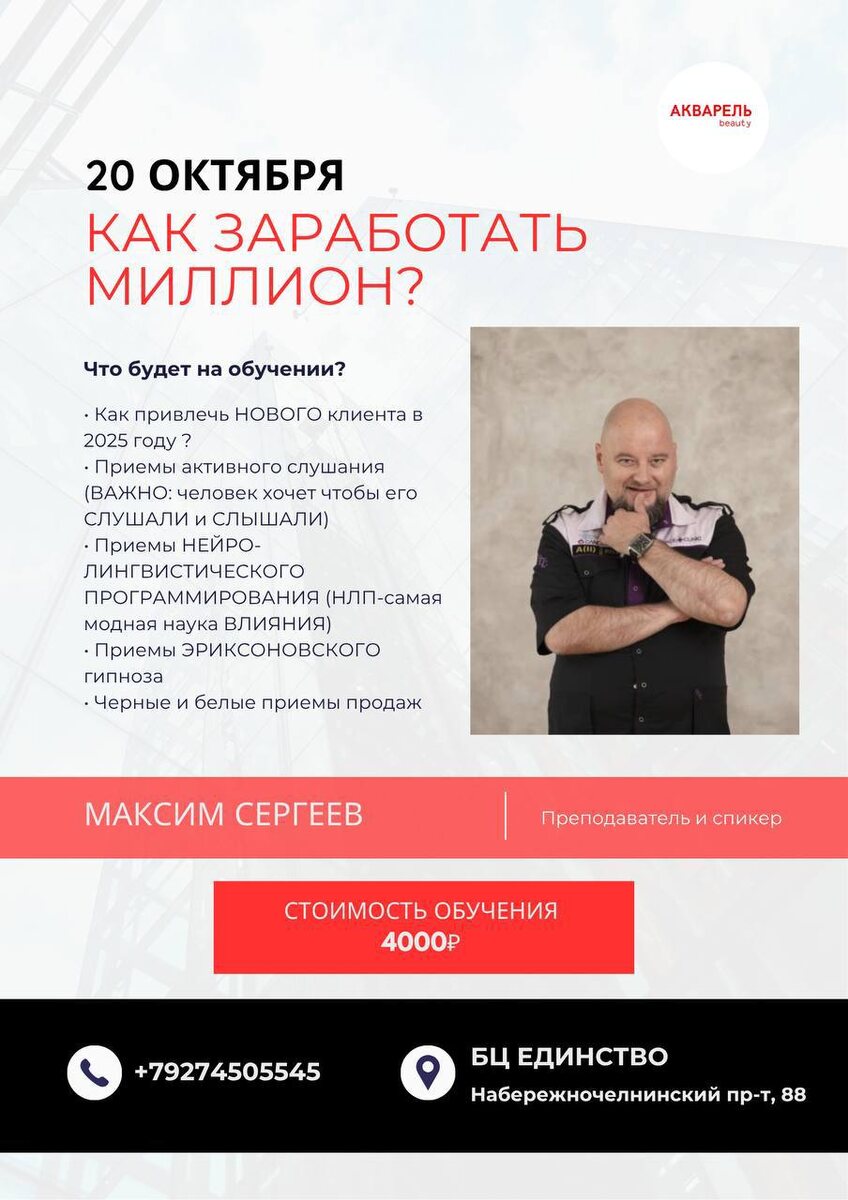 20 октября наша студия Акварель организует тренинг Максима Сергеева на тему " Как заработать миллион" и мы рекомендуем тренинг к посещению!