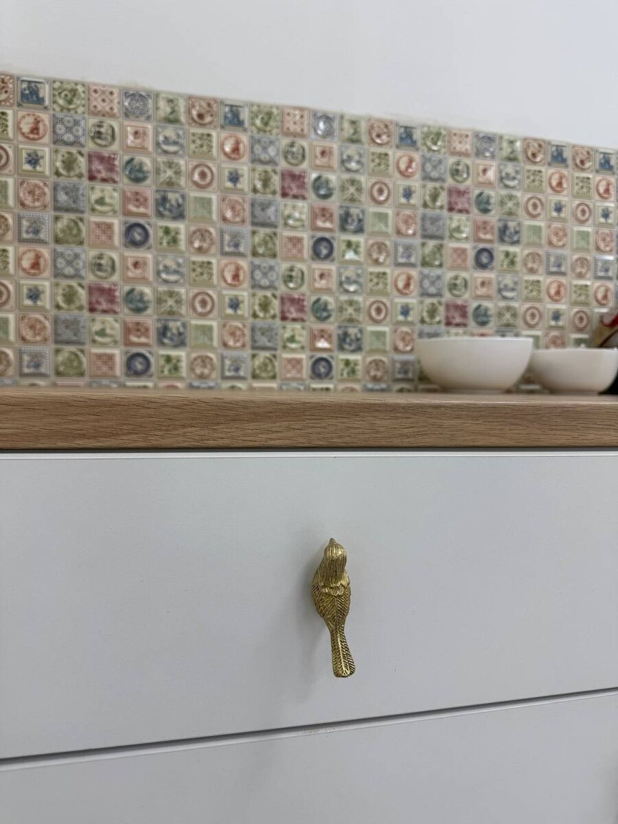 Я просверлила отверстия в дверцах кухни и навесила ручки. Получилось божественно. Скоро сами все увидите.