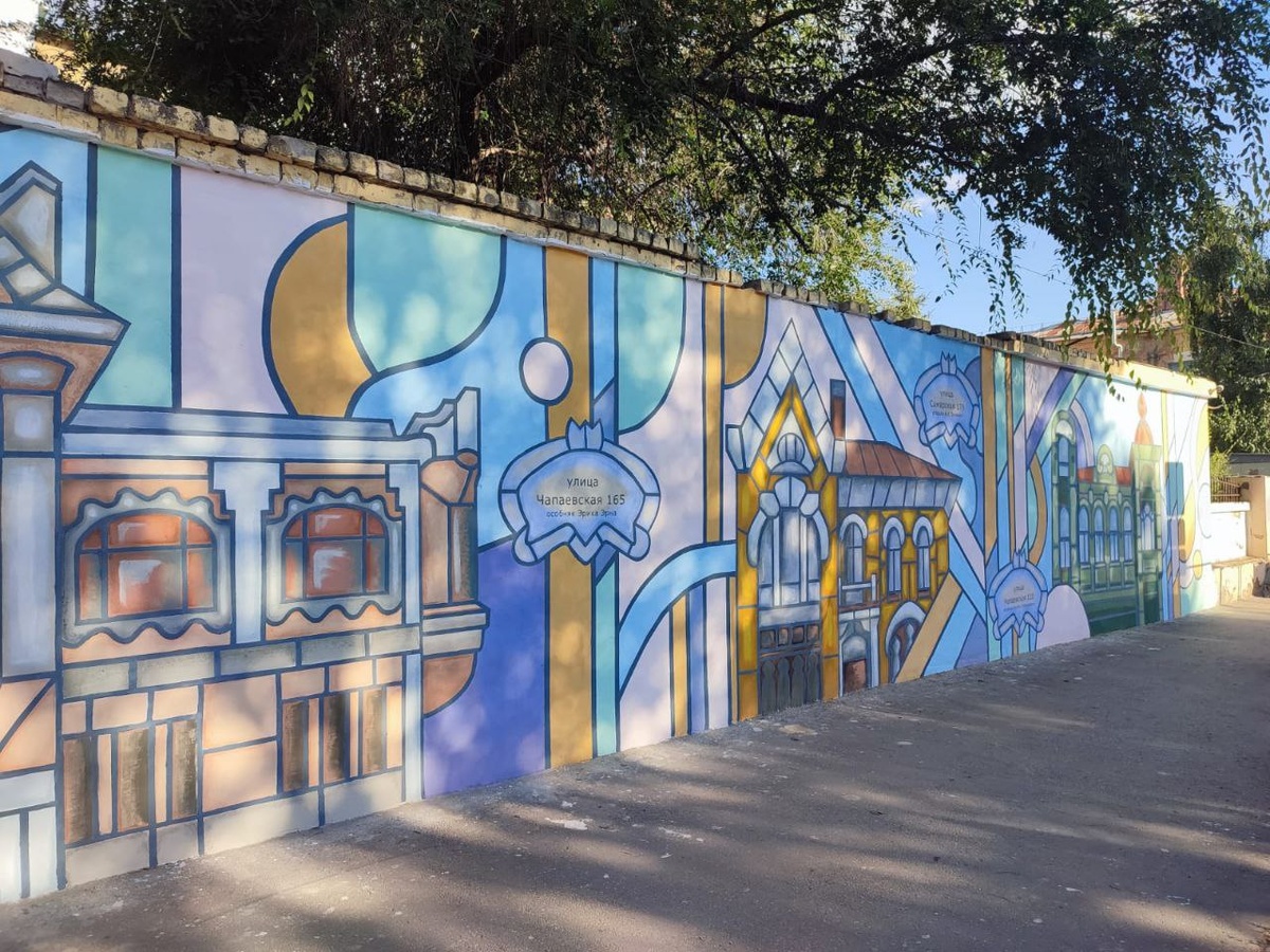 Еще одним муралом в Самаре стало больше. На кирпичном заборе у дома №171 по Чапаевской волонтеры изобразили картину-эклектику «Самарский модерн».
