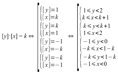 Построить на координатной плоскости график уравнения [y]·[x] = k , где k – простое число. (под целой частью числа t понимается наибольшее целое число, не превышающее заданное; её принято обозначать при помощи квадратных скобок: [t]; функция f(t) = [t] определена на всём множестве действительных чисел). Произведение двух целых величин [y] и [x] может быть равно простому числу k в четырёх случаях: Ранее в задании А-94 рассматривалось построение множества точек, описываемого системами, подобными в полученном объединении (рис. 1). Таким образом график заданного в условии задачи уравнения на координатной плоскости есть совокупность четырёх областей, каждая – в форме квадрата со стороной 1. Координаты нижних левых вершин этих «квадратиков» следующие: (k; 1), (1; k), (–k; –1), (–1; –k). Другие задания, имеющиеся на канале, можно найти здесь: Сведения о новых статьях блога выкладываются в Telegram: Shuric_Himik
