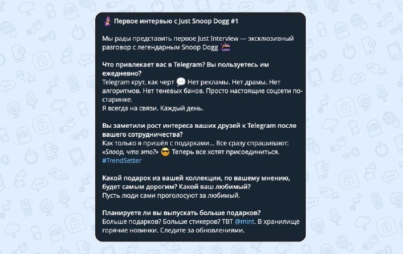 Снуп Догг вкатился в Телегу по-серьёзке — дал своё первое интервью прямо внутри мессенджера и признался: пользуется каждый день и кайфует от