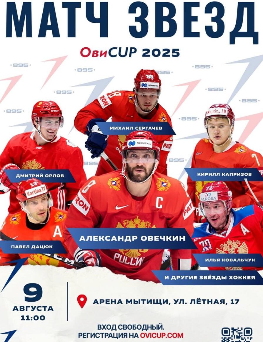 🏆 Бесплатно на Матч звезд Кубка Овечкина с легендарными хоккеистами Главное хоккейное событие лета — Матч звезд Кубка Овечкина пройдёт 9 августа на арене «Мытищи» в Подмосковье. И попасть туда можно будет бесплатно! Главное — успеть поймать регистрацию. Первую партию билетов выгрузили на прошлой неделе, вторую обещают выложить на этой (за анонсами следим здесь). На лёд выйдут: Александр Овечкин, Павел Дацюк, Кирилл Капризов, Илья Ковальчук, Михаил Сергачев, Дмитрий Орлов, Игорь Шестеркин, Матвей Мичков, Кирилл Марченко, Егор Замула, Вячеслав Фетисов, Андрей Николишин и другие хоккеисты. И вместе с ними — звёзды спорта и медиа: Евгений Плющенко, Дмитрий Сычев, Камил Гаджиев, Vobon, Yarkuzya, Repa, Deemy, Hockey Stigg. Перед матчем для зрителей и болельщиков на арене запланировано яркое спортивное шоу и развлекательная программа с розыгрышем призов. После — финал турнира среди юных хоккеистов, награждение от Овечкина и атмосфера настоящего спортивного праздника. 🗓️ 9 августа 11:00