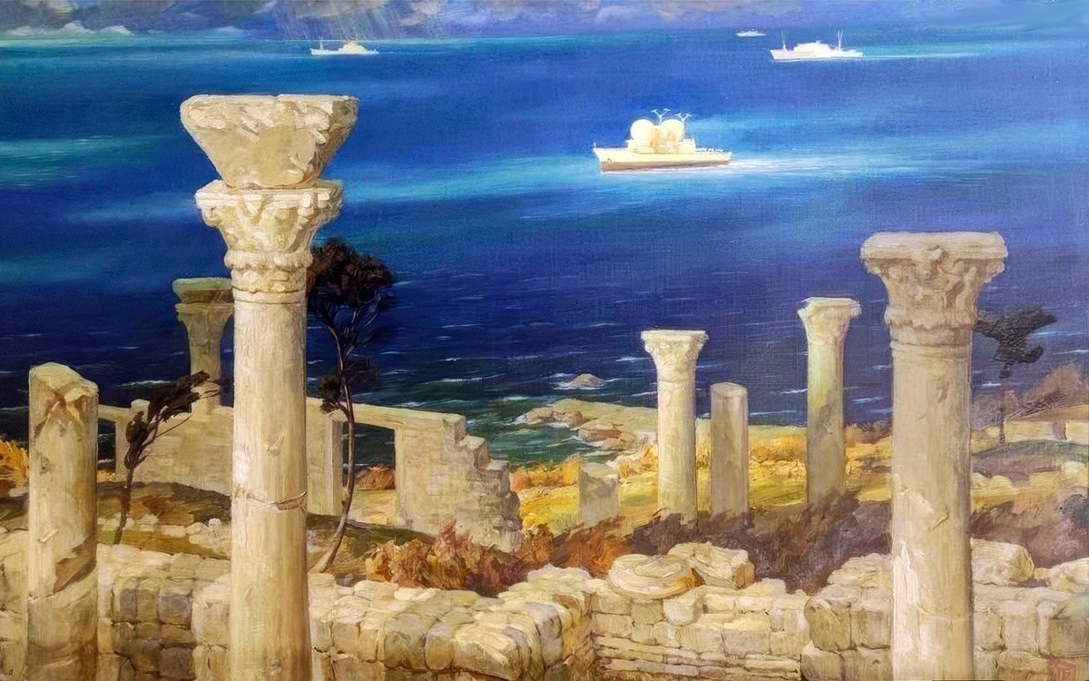 Сегодняшний пост серии #древностинакартине отсылает нас к кисти советского и украинского (а точнее - крымского) художника Геннадия Брусенцова (1927-2006). Этот художник известен и работой в Ашхабаде, и работой в кино (художник-постановщик фильма «Смерти нет, ребята!» (1970)). Однако больше всего Брусенцов писал Крым. В первую очередь - Севастополь, и часто - Херсонес. Вот и на этой картине «Белые пароходы» (1979) мы видим не только судно Службы космических исследований Отдела морских экспедиционных работ АН СССР (по-видимому, «Космонавт Владимир Комаров» с портом приписки Одесса), но и так называемую базилику 1935 года в Херсонесе, самую знаменитую постройку средневекового Херсона (в византийское время этот город назывался именно так), изображенную как на украинской купюре в 1 гривну образца 1992 года, так и на российской купюре в 200 рублей.