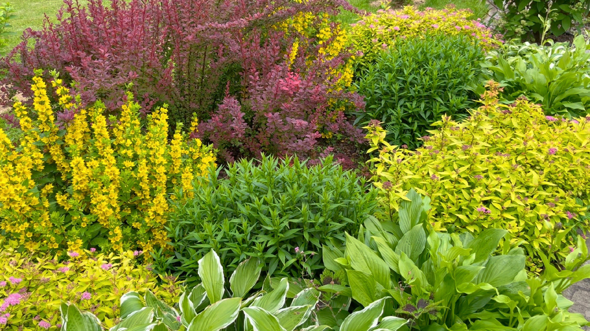 В многолетнем саду, состоящем из многолетний травянистых растений и декоративных кустарников, без цветущих все лето однолетних растений, сложно добиться непрерывного цветения и яркости. Добавить красок многолетней композиции можно подобрав растения с разной окраской листвы.
