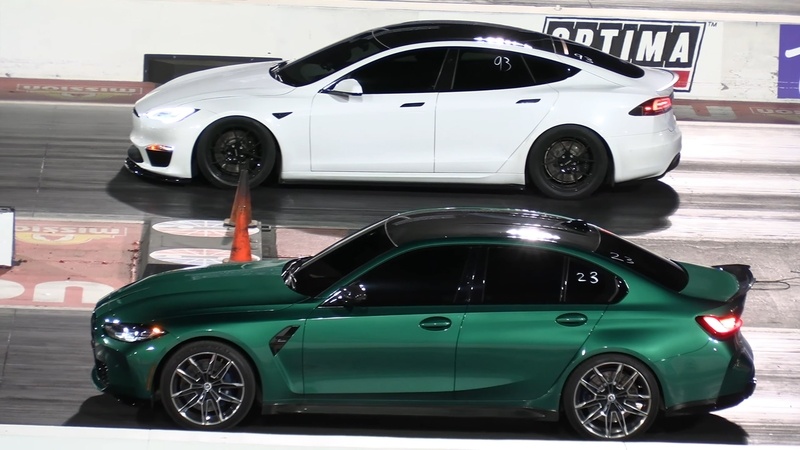 В первом заезде Tesla Model S Plaid буквально уходит в отрыв от BMW M3. Водитель Tesla мгновенно реагирует на сигнал светофора и моментально набирает скорость, оставляя соперника далеко позади. Уже к середине дистанции преимущество Plaid становится настолько очевидным, что пилот BMW даже перестает ускоряться. Итоговый результат Tesla — 9,86 секунды на четверти мили (402 м) с максимальной скоростью почти 233 км/ч. Для BMW M3 это было слишком серьезное испытание: разница в мощности и моменте сказалась моментально.