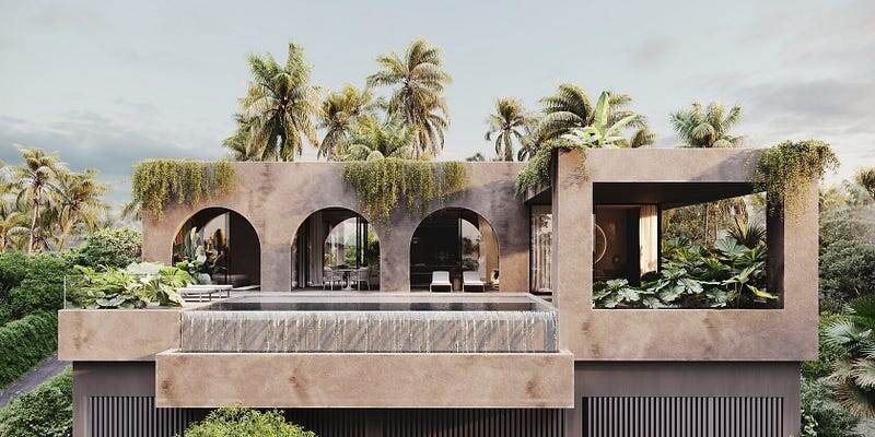 A minimalist concrete structure with arched entryways, flat roof, and cascading vines, set against lush Thai palms — this exterior blends brutalist design with organic softness. Floor-to-ceiling sliding glass doors, oversized balcony planters, and clean geometric lines frame the upper level, offering uninterrupted jungle views and natural airflow. A dramatic infinity-edge pool meets a triple-arched facade and green roof accents, creating a cinematic visual flow between structure and nature. An open lounge with built-in seating, natural stone flooring, and dense tropical landscaping — designed for seamless indoor-outdoor living. Elegant minimalist space blending comfort with nature. A peaceful retreat with modern tropical design. A seamless blend of modern luxury and organic warmth. Spa-inspired tropical bathrooms blending raw textures and modern calm. Every detail of this Thailand villa by Vastu Villa reflects a harmonious blend of minimalism, nature, and high-end design. From sculptur