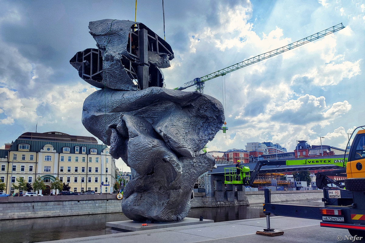 Композиция называется "Большая глина № 4". Скульптуру установили летом 2021 года в преддверии открытия ГЭС-2 после реконструкции. Теперь монумент убирают, начался демонтаж. Любопытно увидеть, что внутри. Однажды швейцарский скульптор Урс Фишер мял в руках глину, и вдруг его осенило, вот она, концепция! Он увеличил комок в 50 раз и придал ему необычную форму. На самом деле, есть и другие варианты: Большая глина № 3, № 5, № 7, № 8. Нам досталась Большая глина № 4. В 2015 году она стояла Нью-Йорке. Через полгода ее увезли во Флоренцию. Там глина пробыла четыре месяца. В Москве - четыре года. Скульптура сделана из алюминия. Ее высота - 12 метров. Визуально казалось, что композиция монолитная, однако, она состоит из идеально подогнанных фрагментов. Части демонтируют друг за другом, начиная сверху. Потом их укладывают на панель и аккуратно закрепляют ремнями. Все происходит очень медленно. Каждый день наблюдаю за процессом. После появления на Болотной набережной "Большой глины" в интернете