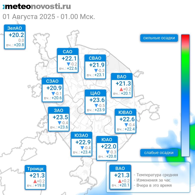 В 1:00 в Москве было от +18.5°C до +23.9°C, средняя температура +21.9°C #погода #Москва #лето #температура #1августа #пятница