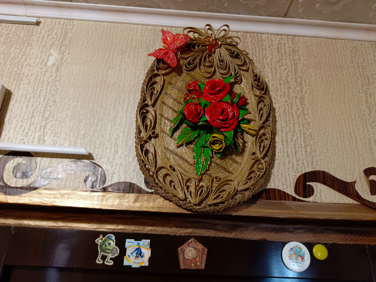 Поднос, основанием для него послужил кожух от бытового вентилятора. Работа бала проделана большая, я порой удивляюсь как у супруги хватает терпения на такую кропотливую работу