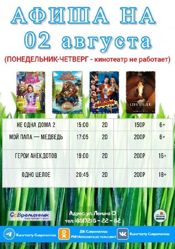 Друзья, делимся с вами афишей кино на выходные Зачем далеко ходить? 🤔 В Доме культуры «Современник» села Началово показывают новинки фильмов, доступные в прокате! #культурныевыходные #Приволжскийрайон
