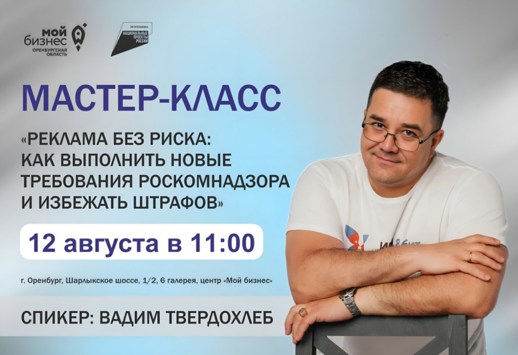 Erid:2RanymtLpFK Приглашаем предпринимателей и будущих владельцев бизнеса на практический мастер-класс по безопасному продвижению в интернете! -12 августа 2025 года -11:00 -г. Оренбург, Шарлыкское шоссе, 1/2 Спикер: Вадим Твердохлеб — руководитель маркетинговой компании ООО «ИВЦ 8 бит» и генеральный директор учебного центра ДПО ООО «ИВЦ 8 бит». Он также автор книг «Роман с бизнесом», «Покори фриланс» и «Получи ключи от личного бренда». Вы узнаете: -Какие виды онлайн-активности подпадают под определение рекламы -Как проверить рекламные материалы на соответствие новым требованиям -Правила работы с персональными данными клиентов -Актуальные изменения в налогообложении рекламных доходов -Безопасные каналы продвижения в 2025 году Особенности мастер-класса: Для кого: Каждый участник получит: Количество мест ограничено! Регистрация обязательна: https://мойбизнес56.рф/events-calendar/master-klass-reklama-bez-riska-kak-vypolnit-novye-trebovaniya-roskomnadzora-i-izbezhat-shtrafov/?erid=2RanymtLp