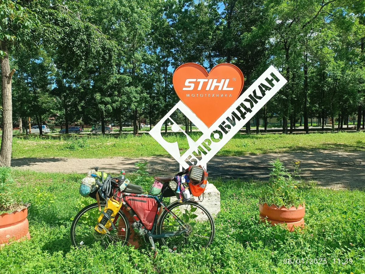 #Биробиджан Нашёл целых три стелы "я люблю биробиджан" Улица шолом алейхема, нумерация домов на двух языках, семисвечник на вокзале. Камер на велик не купил, у всех есть камеры на автонипель, ни у кого нет на presta. Уповаю на аллаха, что смогу доехать до Хабаровска без нескольких шиномонтажей и поклеек латка на латку по дороге [Олег Мачульский]