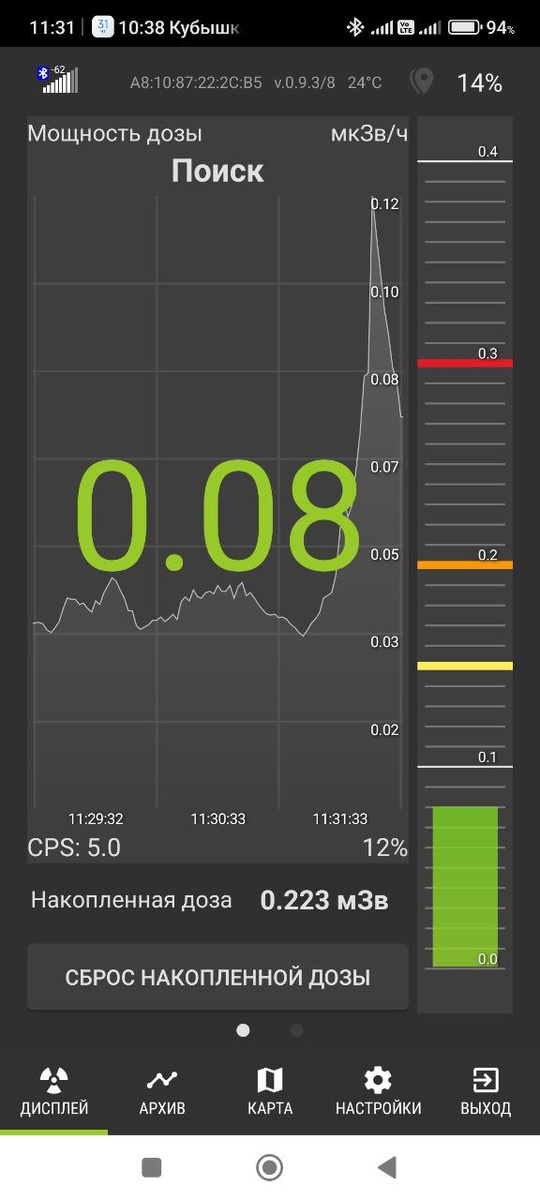 Где искать радиацию в городе? Конечно же она может скрываться в подземных переходах. Первый график подьем мощности дозы гамма излучения до 12 мкЗв/ч, переход под ул. Попова (Пермь), между Коммунальным мостом и ул.Монастырская. Второе увеличение фона до 18 мкЗв/ч в соседнем красивом переходе под ЖД дорогой. Для прохождения по переходу эти значения не представляют какой либо опасности. Некоторые люди постоянно живут в подобных условиях. Обусловлены такое состояние подземных переходов скорее всего гранитной отделкой, скоплением выделившегося радона и его ДПР.