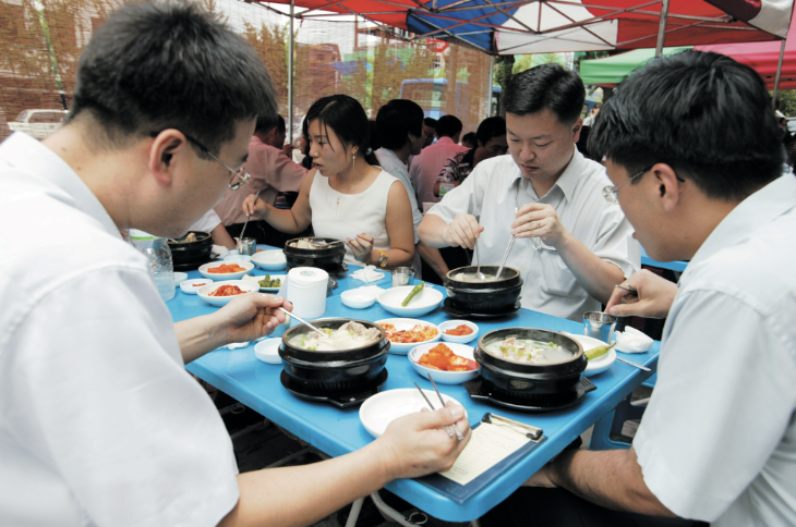 "Суп из собаки, сваренный с зелёным луком, называется кечжан (개장). Лучше всего, если добавить курицу или побеги бамбука. Если посыпать красным перцем и съесть с рисом, можно восполнить энергию тела. Согласно “Историческим запискам”, впервые жертвоприношения в Самбок были проведены в 2-й год правления князя Дэ Гун (676 г. до н.э.) в государстве Цзинь. У главных ворот города приносили в жертву собаку, чтобы защититься от насекомых. Это стало началом традиции есть суп из собаки в Самбок".