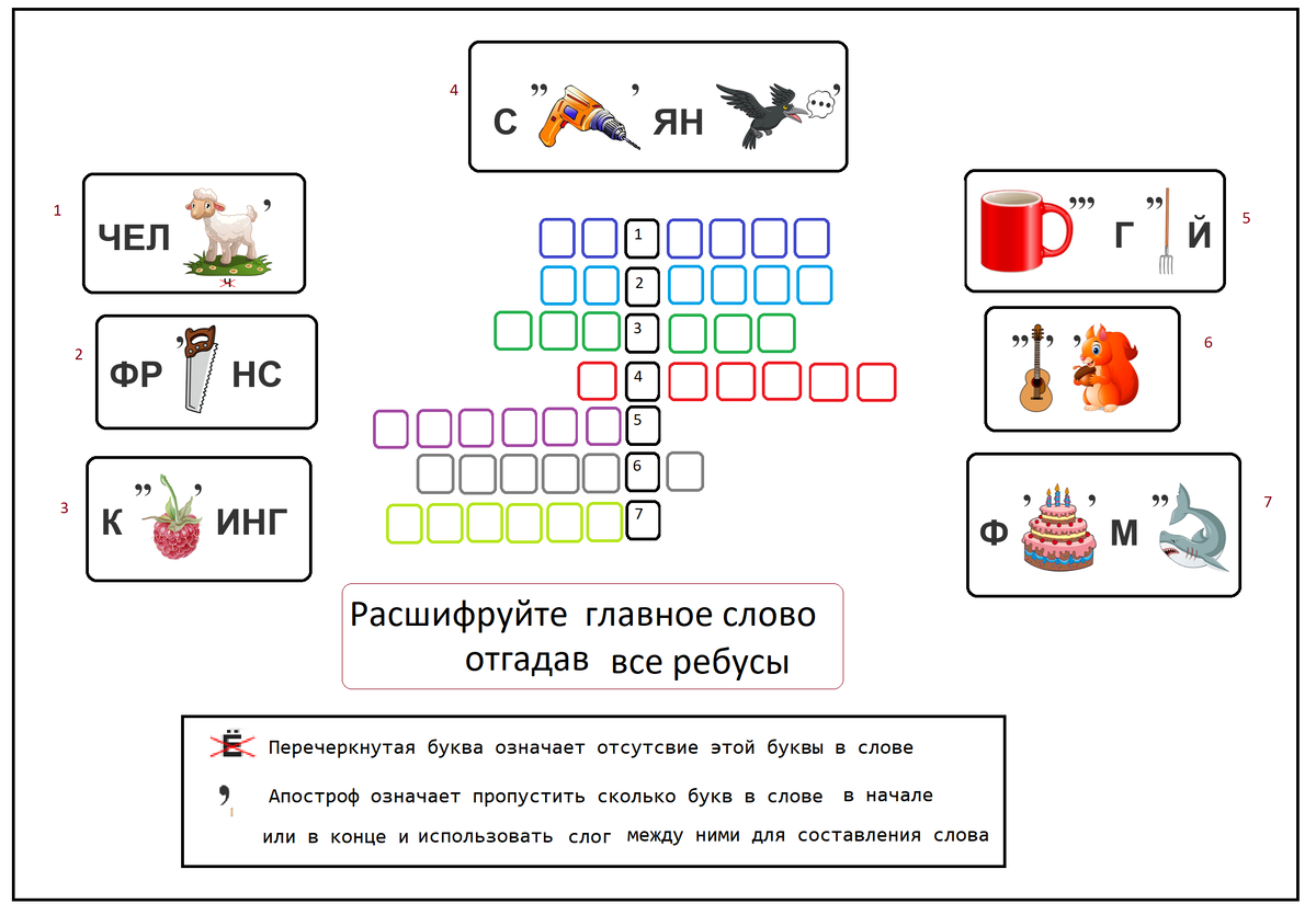 Мы подготовили для вас новое задание из раздела ребусы. Вам необходимо разгадать главное слово помеченное черными квадратиками. Чтобы его разгадать необходимо расшифровать каждый ребус под каждым номером. Правило разгадывания ребусов находится ниже задания.