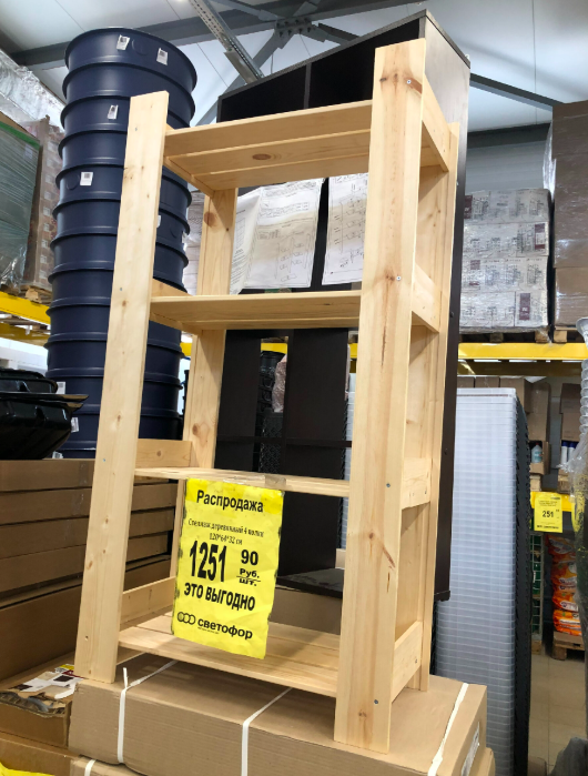 Начнем с распродажи: деревянные стеллажи из массива березы теперь можно купить дешевле. Размер: 64×32×120 см, в разобранном виде, удобно перевозить даже в общественном транспорте. Отлично подойдут для балкона или кладовки. Цена снижена примерно на 20%. 1251 рубль