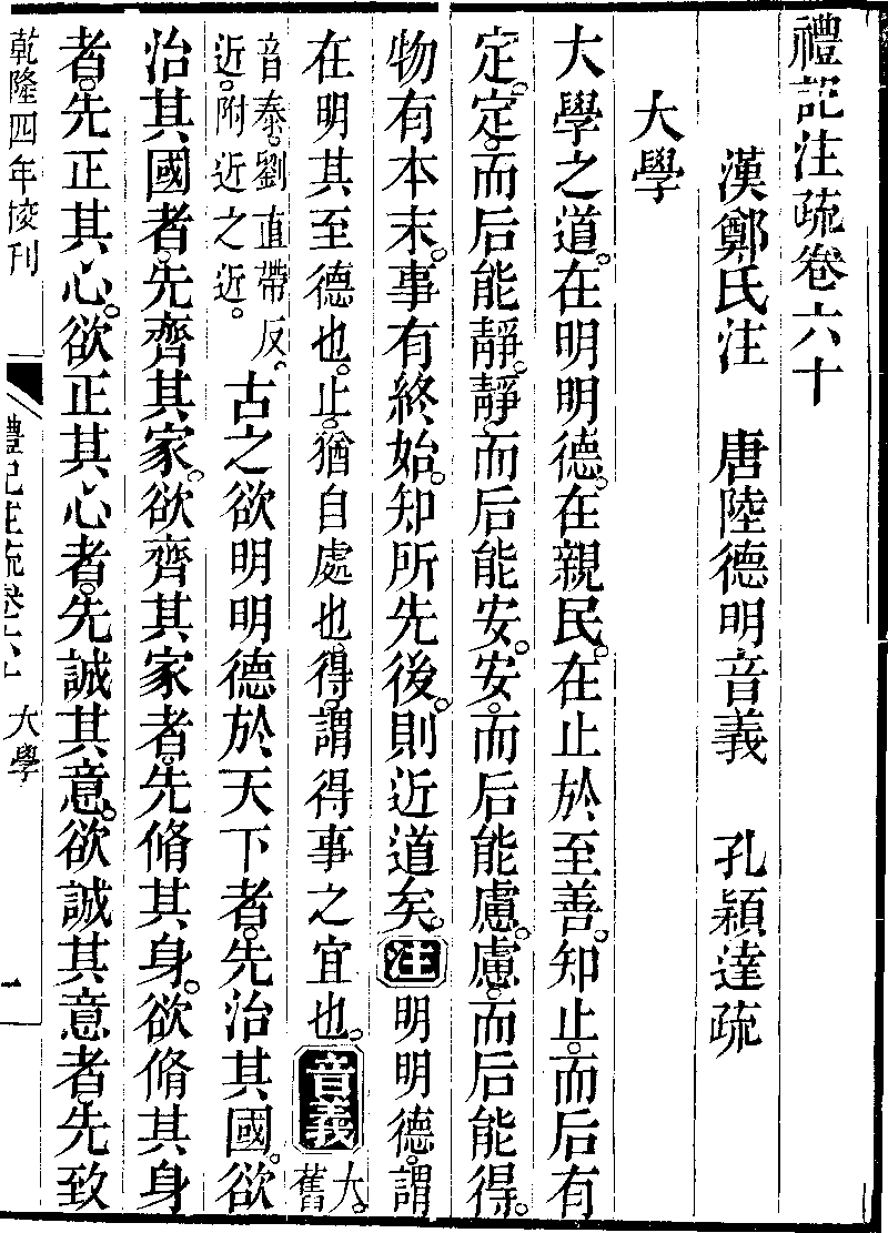 Великое Учение учит тому, как демонстрировать выдающуюся добродетель, обновлять людей и находится в достижении высшего совершенства. Когда известно, где остановиться, определяется стабильность порядка; и, определив её, можно достичь спокойной невозмутимости. За этим спокойствием последует безмятежный покой. В этом покое возможно тщательное размышление, а за этим размышлением последует достижение желаемой цели. У вещей есть свои корни и ветви. У дел есть свои начало и конец. Знание того, что первично, а что – нет, приблизит к тому, чему учит Великое Учение". Итак, в первом же предложении речь идет о понятиях 德 – добродетели, 至善 – достижения «добра» или высшего со