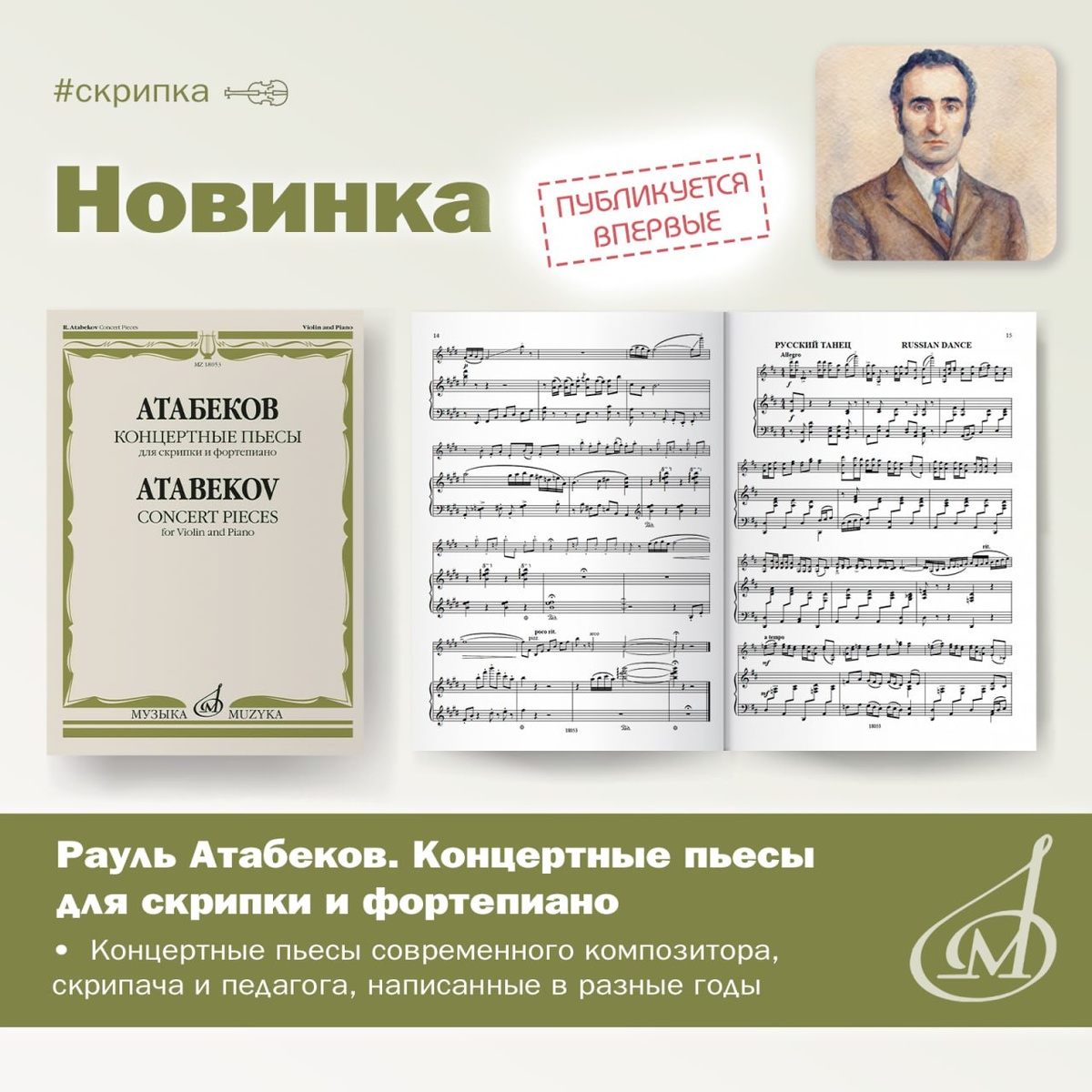 ⚡Новинка: Р. Г. Атабеков. Концертные пьесы для скрипки и фортепиано Издательство «Музыка» продолжает публиковать произведения замечательного советского и российского композитора Рауля Атабекова. ⏺️Рауль Георгиевич Атабеков (р. 1937) — скрипач и композитор, в творческом наследии которого ряд симфоний, концертов, квартетов и камерных произведений. Атабеков много лет посвятил педагогической деятельности. Кроме того, возглавлял камерный оркестр «Юные виртуозы» ЦМШ при Московской консерватории, а также руководил струнной группой Всемирного детского оркестра под управлением Л. В. Николаева. ⏺️Настоящий сборник предлагает несколько разнохарактерных пьес, которые в целом продолжают традиции романтической инструментальной миниатюры, с её жанровым разнообразием, яркой образностью и этническими мотивами. Например, здесь можно найти «Юмореску», «Русский», «Армянский», «Испанский» и «Грузинский» танцы, а также «Цыганскую рапсодию». 📖 Более подробно с содержанием сборника можно ознакомиться на