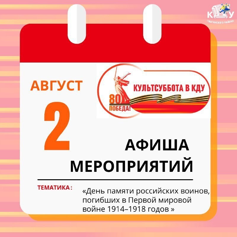 Делимся новой подборкой мероприятий проекта «Культсуббота в КДУ», которые пройдут в субботу в филиалах нашей системы☺️ ▶️10:00 ЦНК им. Н.Р. Нагоевой Видео-лекторий «Памятная дата России» ▶️11:00 ДК им. П.Х. Афанасова Час истории «Забытая война» ▶️19:00 Гончарский СДК Показ фильма «Адмирал» ▶️11:00 Келермесский СДК Мастер-класс «Гвоздика - символ памяти» ▶️20:00 СДК п. Новый Тематический час «Исторические факты первой мировой войны» ▶️12:00 Дондуковский СДК Кинопоказ «День памяти» ▶️10:30 Сергиевский СДК Исторический час «Дорогами памяти» ▶️11:00 Тамбовский СДК Час памяти «День памяти российских воинов» ▶️15:00 СК х. Садовый Урок изобразительного творчества «Памяти о первой мировой» ▶️12:00 Днепровский СК Информационный час «Первая мировая война»