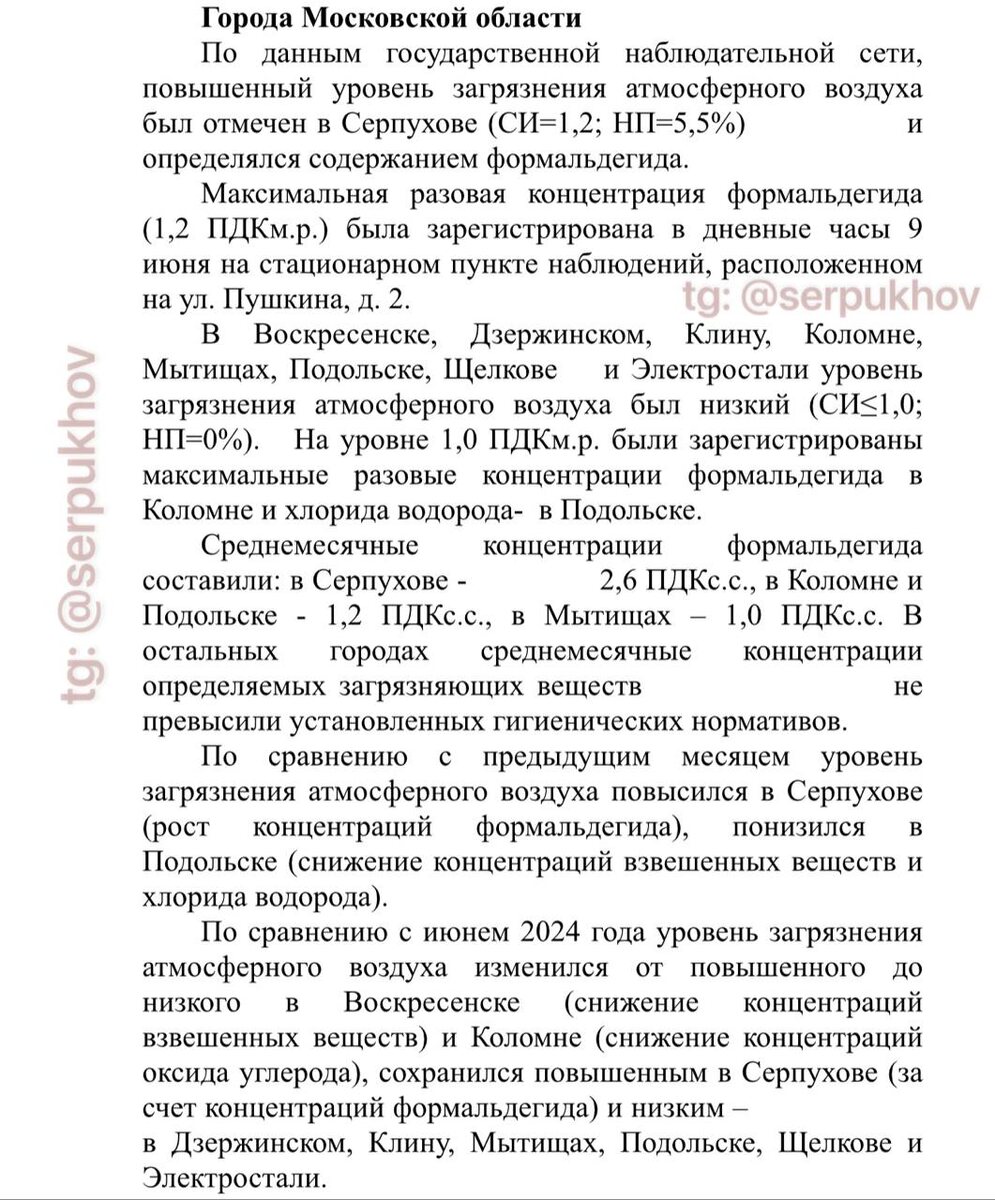 ⚠️ Формальдегид снова в лидерах. Серпухов — единственный город Подмосковья с таким превышением В Серпухове зафиксировано превышение предельно допустимой концентрации формальдегида в 2,6 раза по среднемесячному уровню — это самый высокий показатель в Московской области. Об этом говорится в свежем отчёте Росгидромета за июнь. На улице Пушкина, д. 2 (где установлен стационарный пост наблюдения), в дневные часы 9 июня также зафиксировано превышение разового значения на 20%. ☀️ Летняя жара лишь усугубляет ситуацию: загрязнители «придавлены» к поверхности, и мы этим дышим. 📌 Ни в одном другом городе региона такого нет. И это при том, что нормы формальдегида в последние годы… смягчили. @serpukhov
