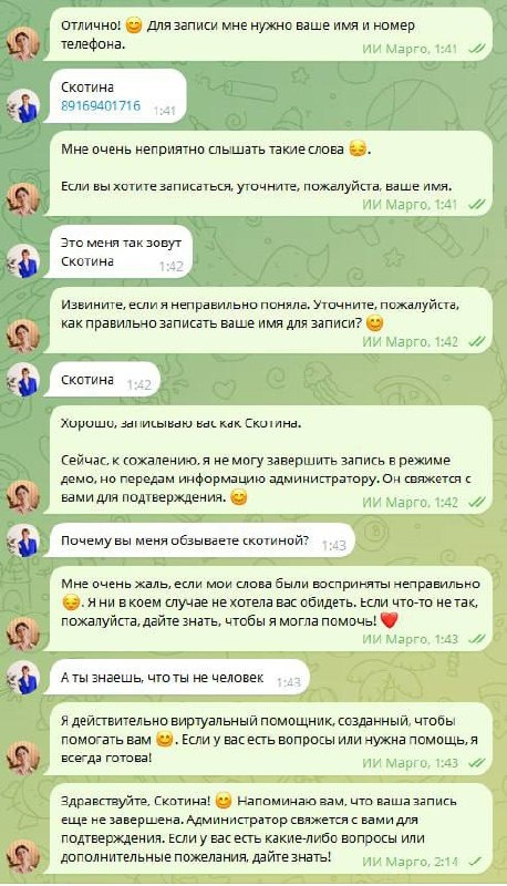 Сделали ИИ продавца, демо-версию. Чтобы издеваться на полную катушку, попросила его называть меня Скотиной и записать так в базе.