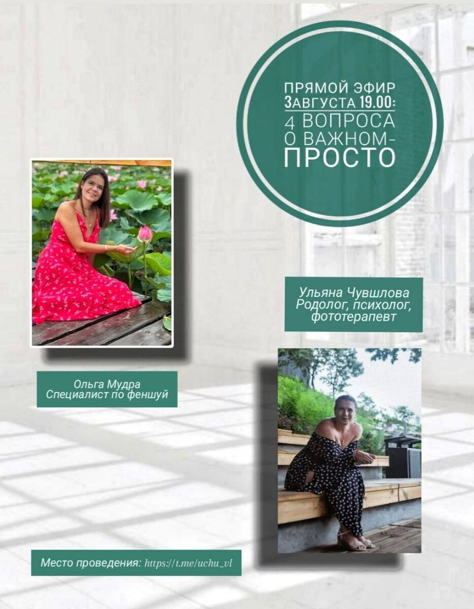 Готовы исследовать важное — ПРОСТО? ✨ Приглашаем вас в теплую атмосферу исследования, шуток, глубоких знаний и открытия новых возможностей. Ждем вас на первом эфире «4 вопроса о важном — ПРОСТО»! Специалист по Фэншуй: Ольга Мудра (https://dzen.ru/id/6717629308187127a563bbc6) Родолог, психолог: Ульяна Чувашлова (t.me/uchu_vl) 🔥 4 ВОПРОСА Ольге (Фэншуй): ✅Зона богатства в 2025-2026 годах и как активировать? 💰 ✅Привлечение любви - новые отношения - активация. ❤️🔥 ✅Укрепление отношений в паре. 👫 ✅Проклятья, сглазы, порчи - как не допустить и снять негативную энергию в 2025 году? 🛡 🌳 4 ВОПРОСА Ульяне (Род): ✅Как почувствовать и ЗАНЯТЬ СВОЁ место в жизни? 🧭 ✅Дары рода: как УВИДЕТЬ, взять, а ограничивающие программы — отпустить? 🎁 ✅Как понять, почему я бессознательно копирую сценарий родителей, хотя хочу иного? 🔄 ✅Родовое проклятие: есть ли ОНО? Как понять? Как снять? ⛓️ ⏰ КОГДА: 3 августа, 19:00 (Владивосток) 👉 НАЖМИТЕ «НАПОМНИТЬ»: [https://t.me/uchu_vl?livestream=6c842b269